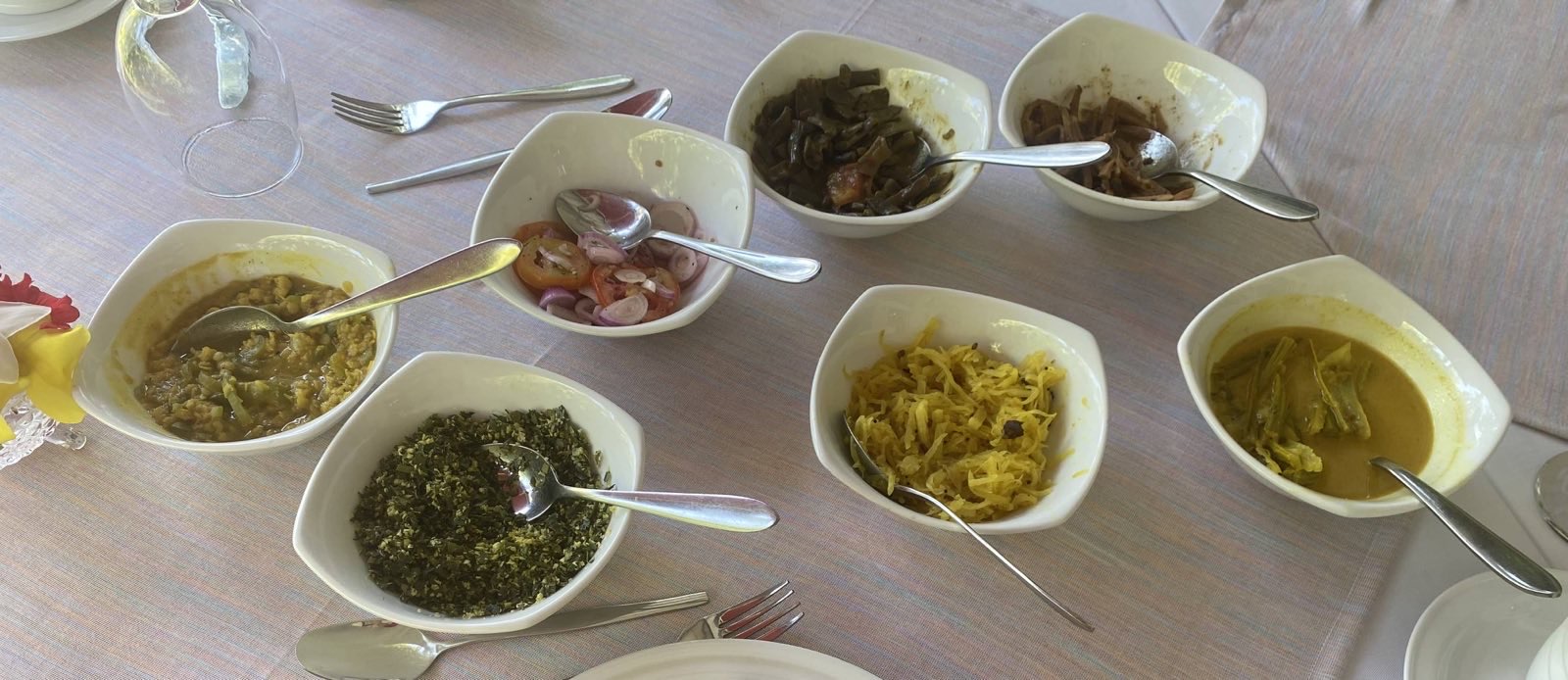 Den rechten Arm weit ausgestreckt gen Himmel, auf der flachen Hand ein Tablett, beladen mit 7 Schüsseln, erreicht Precip den Tisch des Restaurants der Villa Safira. Der Tisch ist bedeckt mit einer weißen ...